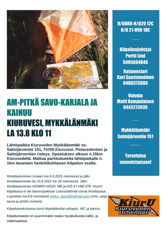 Huom! kilpailukeskuksen osoite on: Salmijärventie 151 Kilpailussa ei ole lisenssipakkoa! Lisenssittömät voivat ilmoittautua s-postitse mikko_sport@hotmail.com (nimi, sarja, seura ja emitin numero) Ilmoittautumismaksu maksetaan KiurU:n tilille: FI68 5157 0620 0286 96 (viestikenttään nimi, sarja, seura ja teksti Savo-Karjala ja Kainuu AM-pitkä tai viesti 2022) Kisasivut: https://kiuruvedenurheilijat.sporttisaitti.com/suunnistus/am-savo-karjalan-kainuun-pitka-j/ Ilmoittautuminen Irman kautta Henk.koht matka 13.8: Viesti 14.8: |