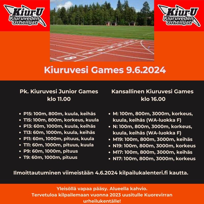 Kiuruvesi Junior Games kilpaillaan su 9.6 klo 11.00 alkaen https://www.kilpailukalenteri.fi/?cs=16&nid=34111 Kiuruvesi Games kilpaillaan su 9.6 klo 16.00 alkaen |