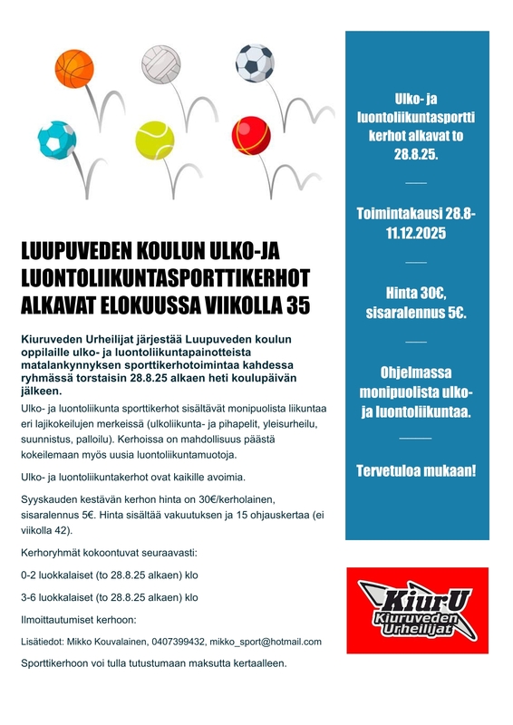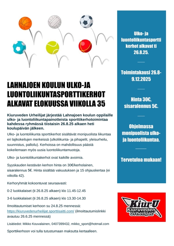 Ilmoittautumiset Lahnajoen kerhoon syyskausi 2025: https://kiuruvedenurheilijat.sporttisaitti.com/yleisurheilu/sporttikerho-lahnajoki-syyskausi/ilmoittautuminen-lahnajoen-sport/ Ilmoittautumiset Luupuveden kerhoon syyskausi 2025: https://kiuruvedenurheilijat.sporttisaitti.com/yleisurheilu/sporttikerho-luupuvesi-syyskausi/ilmoittautuminen-luupuveden-spor/