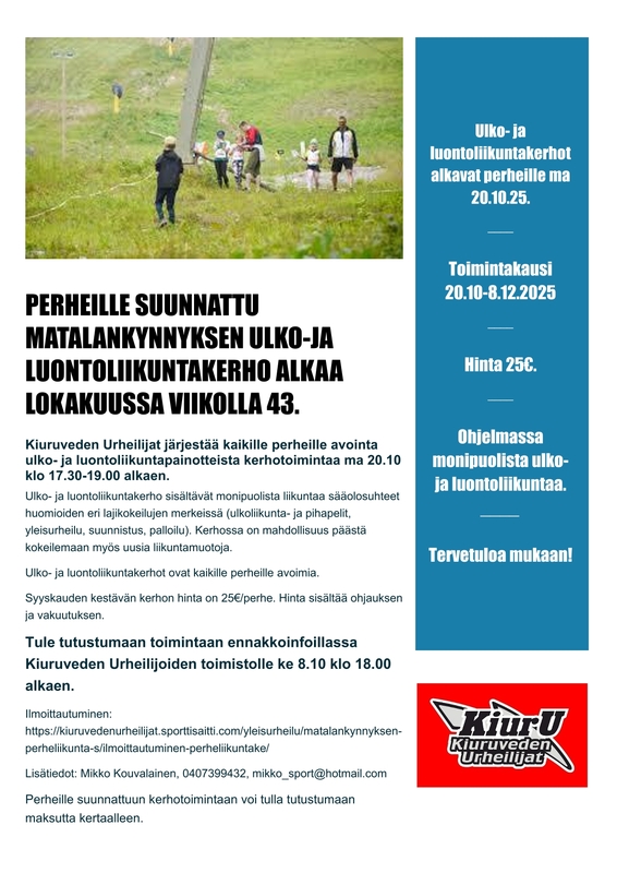 Ilmoittautumiset: https://kiuruvedenurheilijat.sporttisaitti.com/yleisurheilu/matalankynnyksen-perheliikunta-u/ilmoittautuminen-perheliikuntake/ "Tähän toimintaan olemme saaneet opetus- ja kulttuuriministeriön jakamaa seuratukea." |