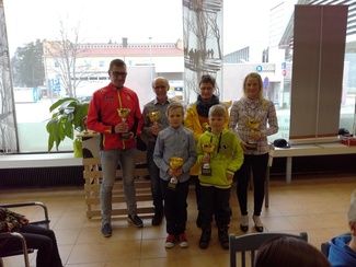![]() Piirin- ja kansallisella tasolla menestyneistä hiihtäjistä olivat paikalla vas. Kari, Teijo, Pirkko, Terhi, Joel ja Niilo |