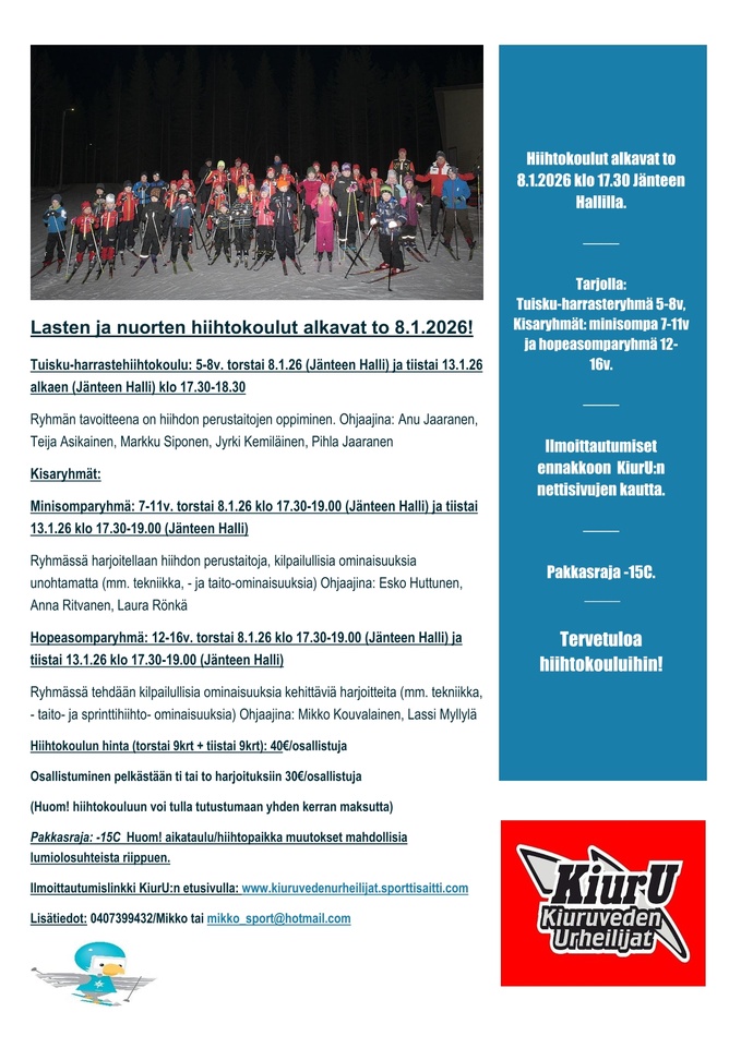 - Hiihtotyyleistä ja tarvittavista varusteista tiedoitetaan viikoittain KiurU facebookissa.